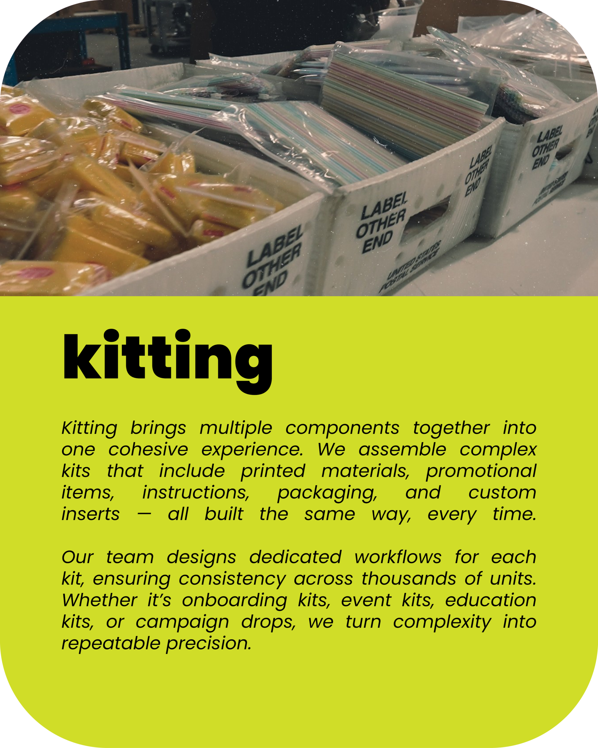 Absolutely. We specialize in high-volume, multi-component kit assembly and fulfillment, including STEM kits, donor mailings, membership boxes, and promotional kits. Whether it’s 100 units or 100,000, we’ve done it.