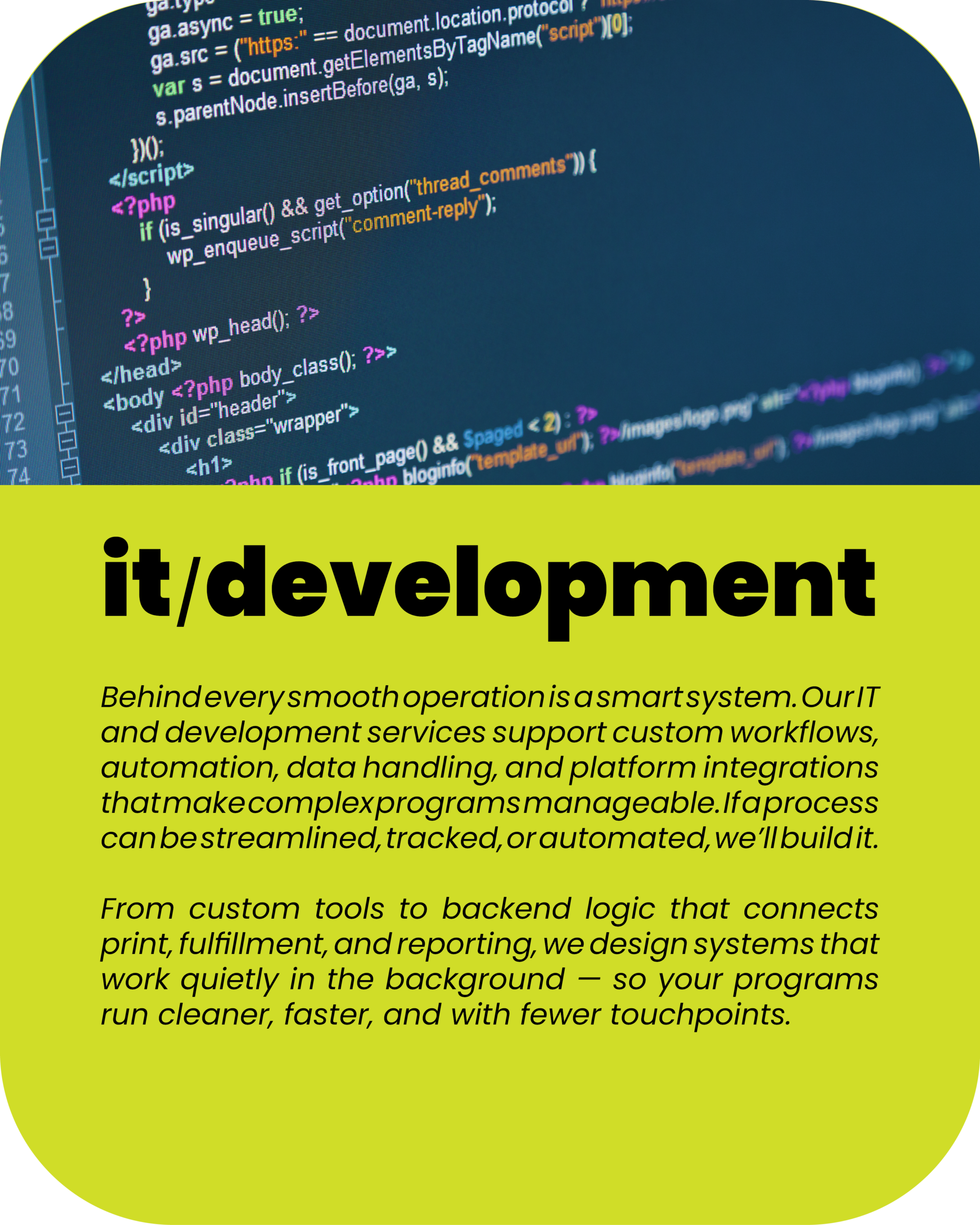 At Blink, we’re not just a service provider—we’re your brand’s best friend. Whether it’s full-scale fulfillment, creative design, direct-mail printing, or tech solutions, we handle it all with speed, precision, and a healthy dose of personality. From brainstorming big ideas to delivering polished results, we’re here to make your projects stress-free and seriously impressive.