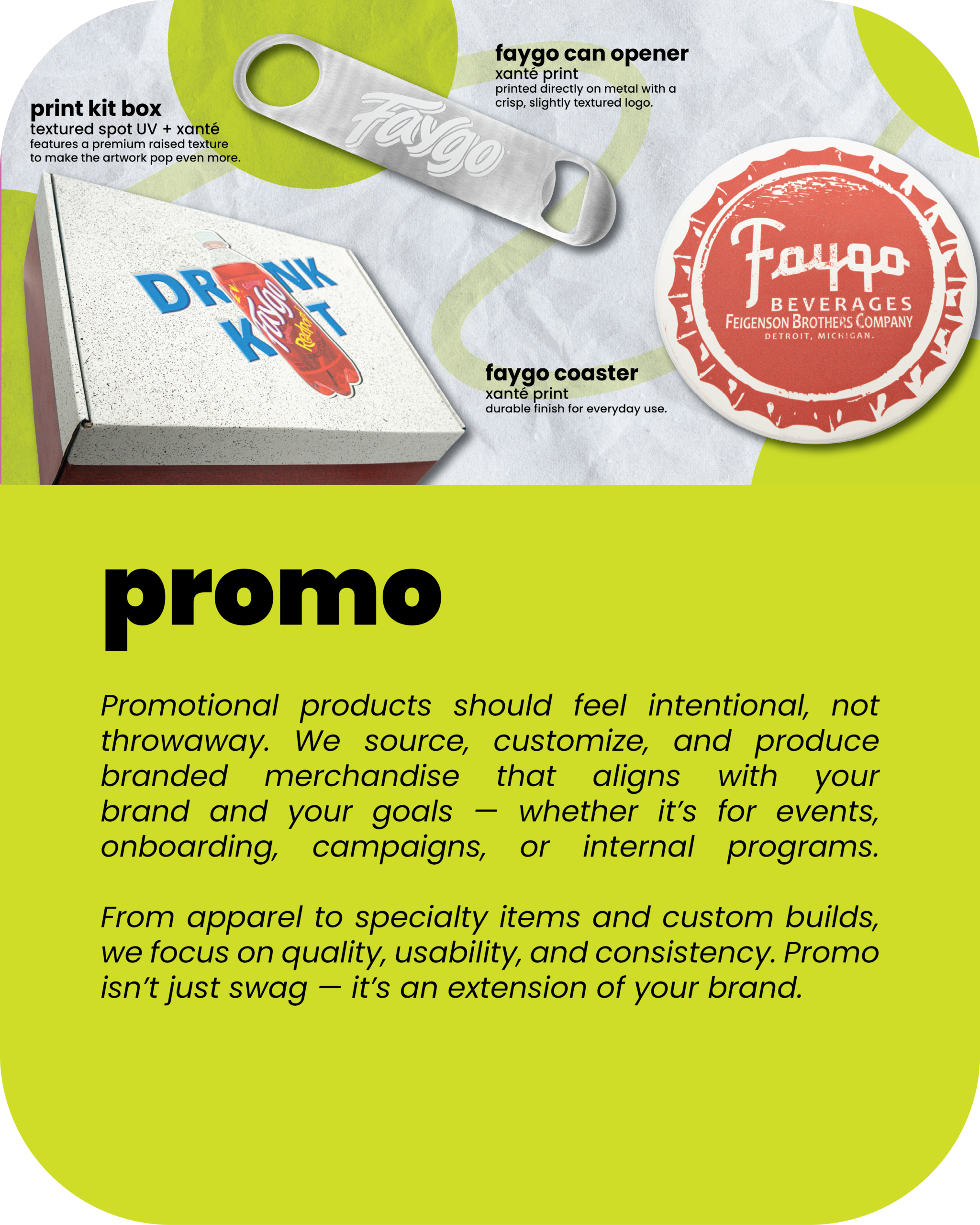 Blink offers end-to-end marketing logistics including creative design, print production, kitting, fulfillment, direct mail, branded merchandise, promotional product programs, and custom storefront management. If your brand needs it shipped, stored, picked, packed, printed, or created, we handle it.